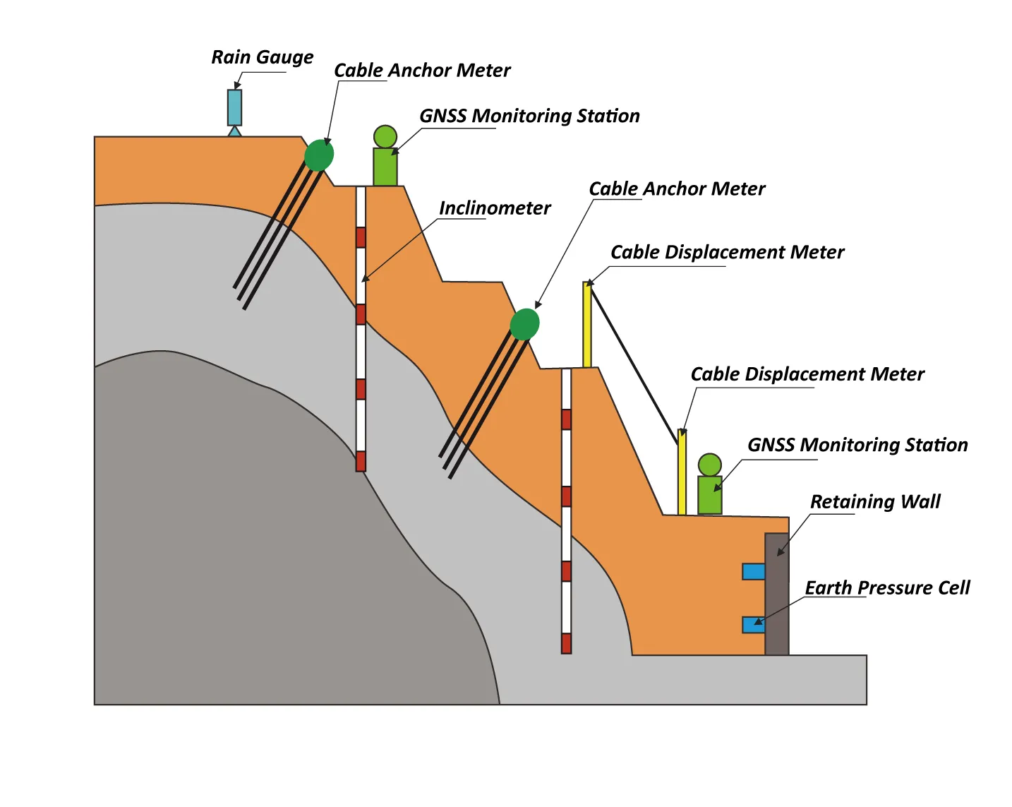 ஆழமான இடப்பெயர்ச்சி கண்காணிப்பு, மேற்பரப்பு இடப்பெயர்ச்சி, நங்கூரம் கேபிள் கண்காணிப்பு, மழைப்பொழிவு கண்காணிப்பு, நிலத்தடி நீர் நிலை கண்காணிப்பு, கேட்கக்கூடிய மற்றும் காட்சி அலாரம் போன்றவை.